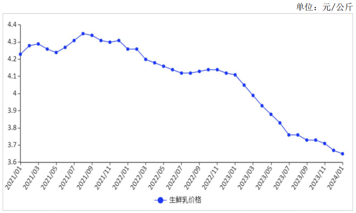 生鮮乳階段性過剩,價格繼續(xù)下行。2024年1月,生鮮乳價格略跌,奶業(yè)主產(chǎn)省生鮮乳收購價每公斤3.65元,環(huán)比下跌0.5%,同比下跌11.2%。